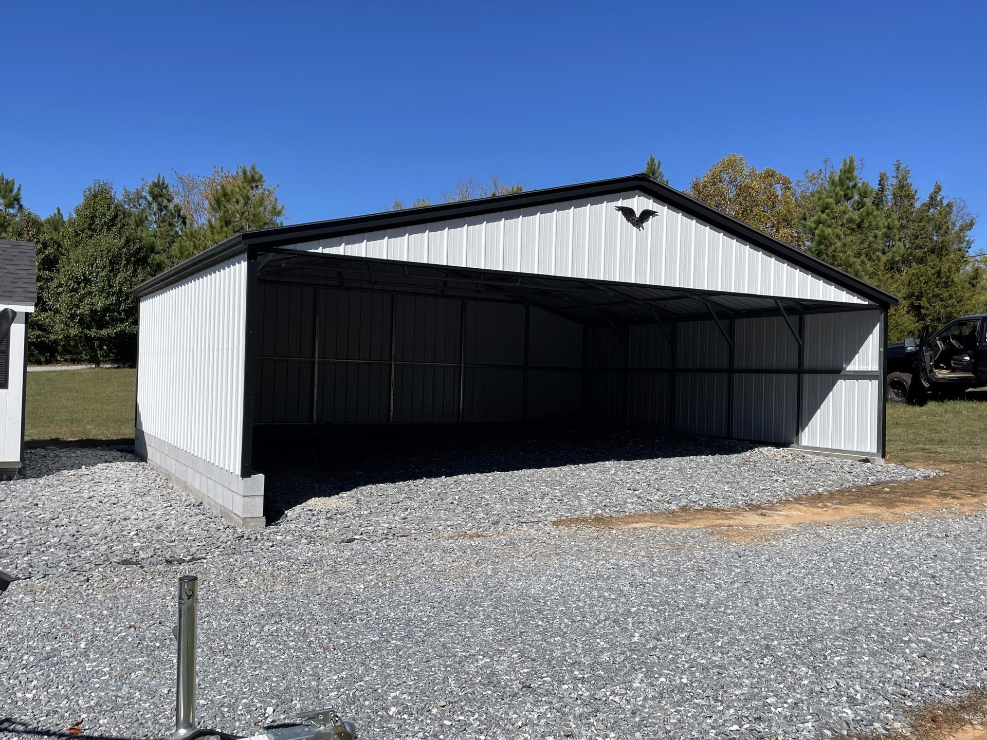 Metal carport with red trim, protecting a dark-colored vehicle on gravel driveway, surrounded by trees.