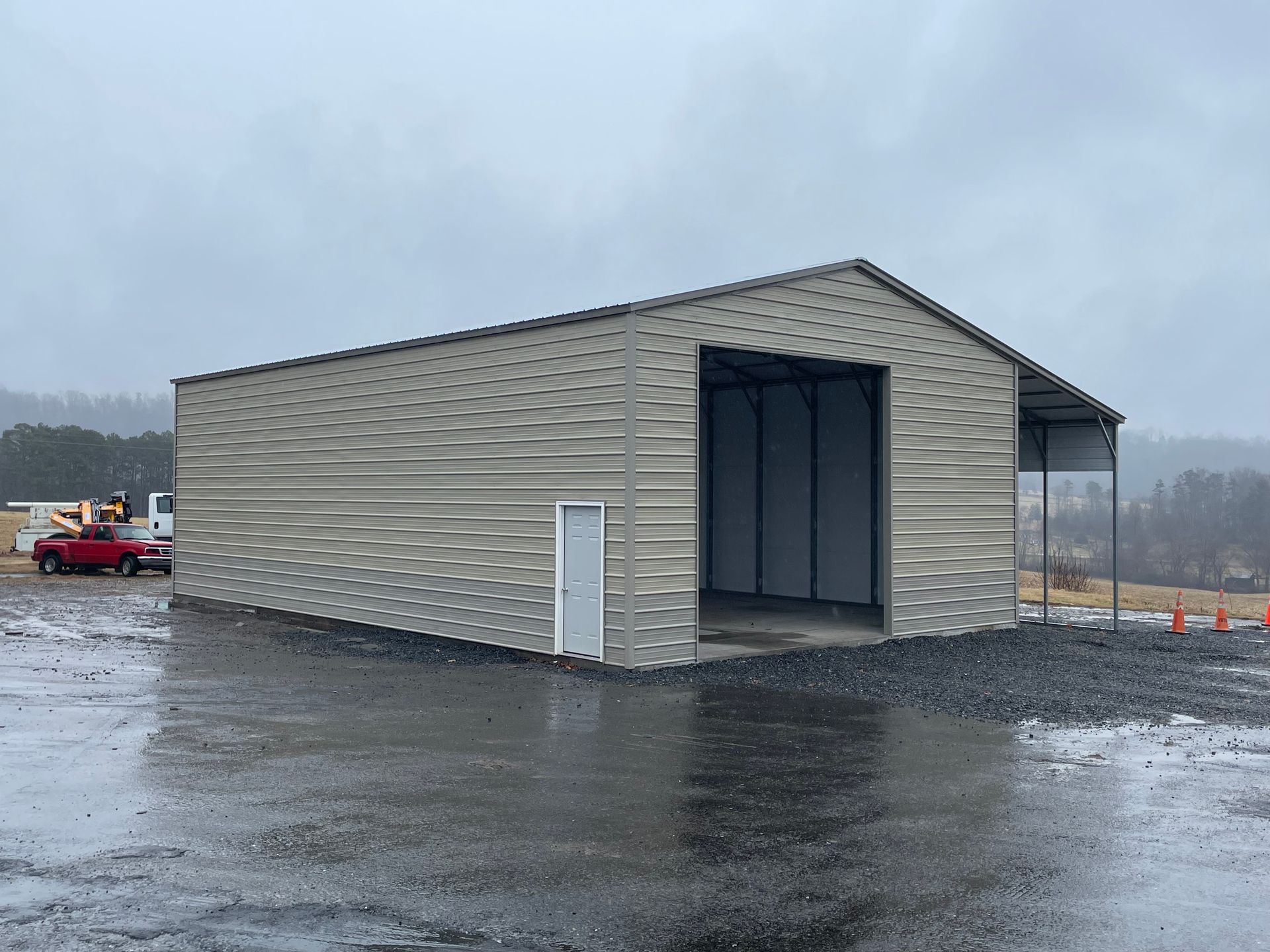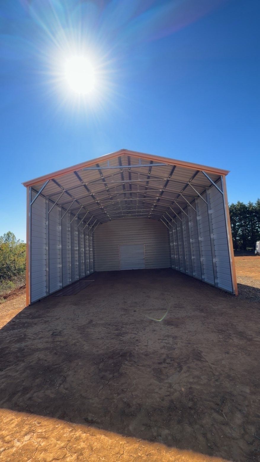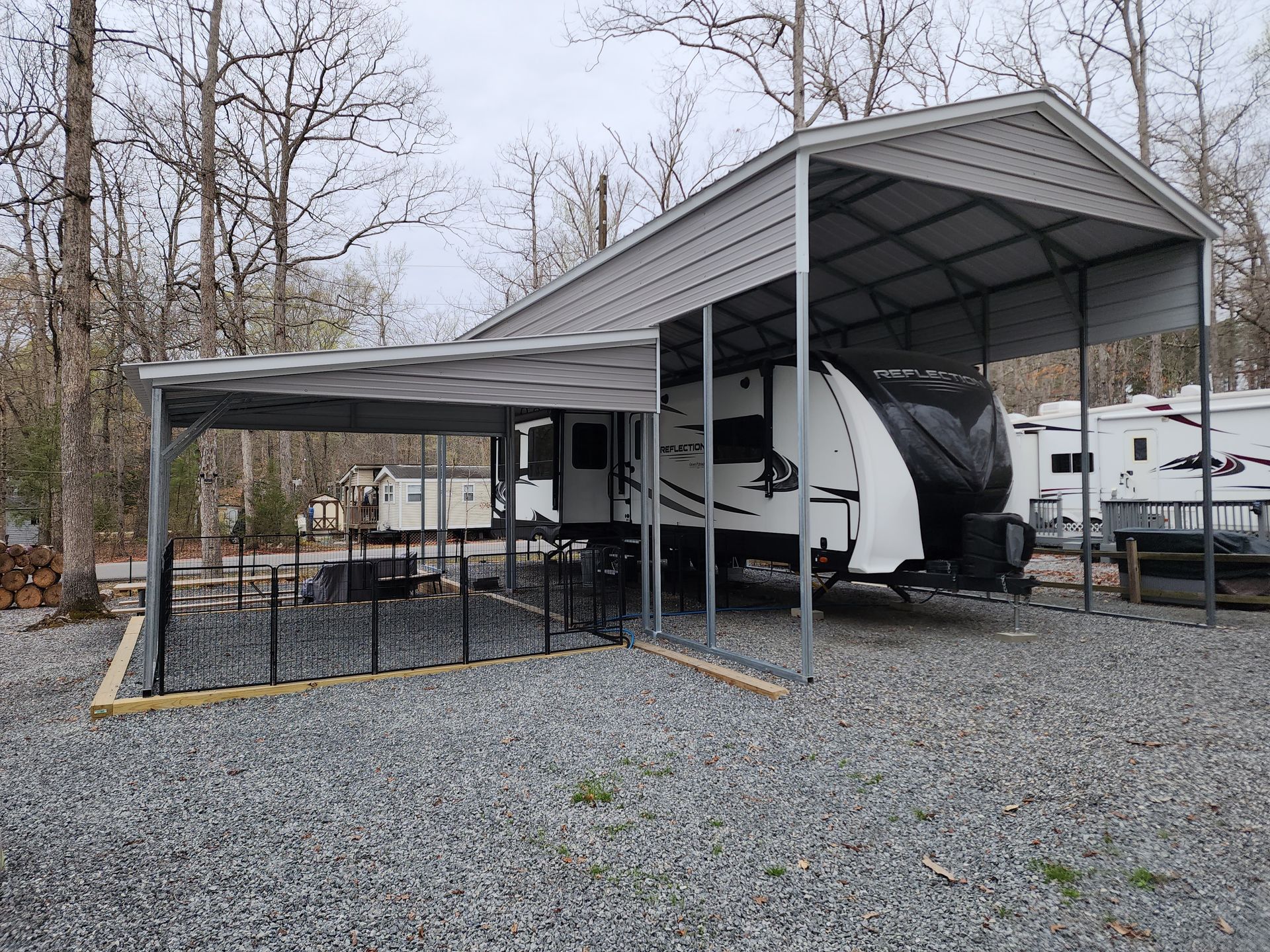 Metal carport with a red roof, located outdoors on a gravel lot. Trees in background.