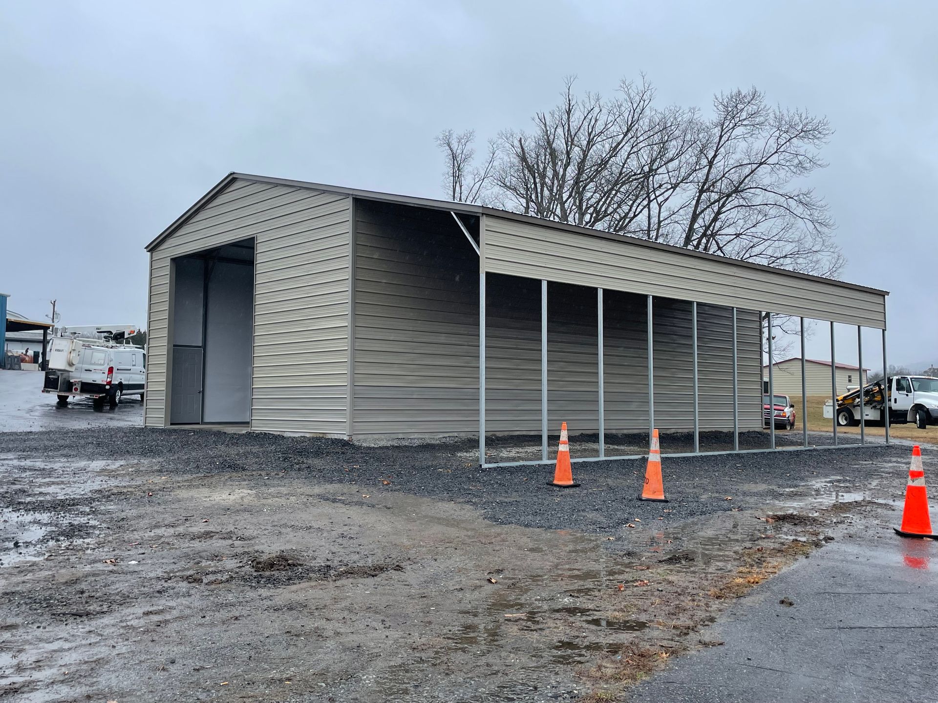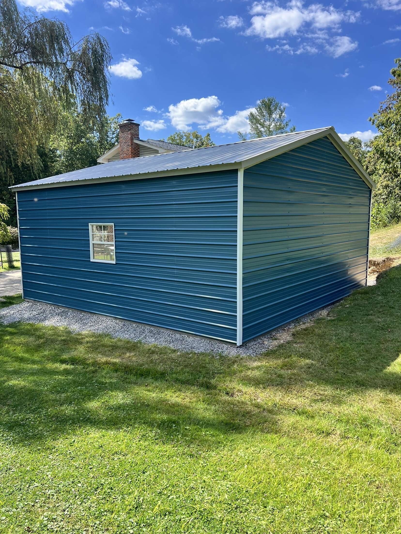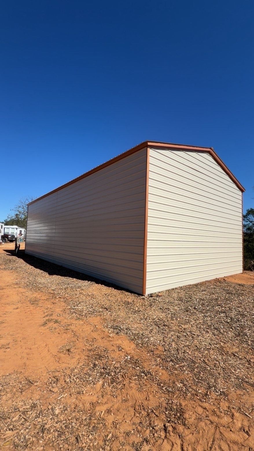 Metal carport with a red roof, located outdoors on a gravel lot. Trees in background.