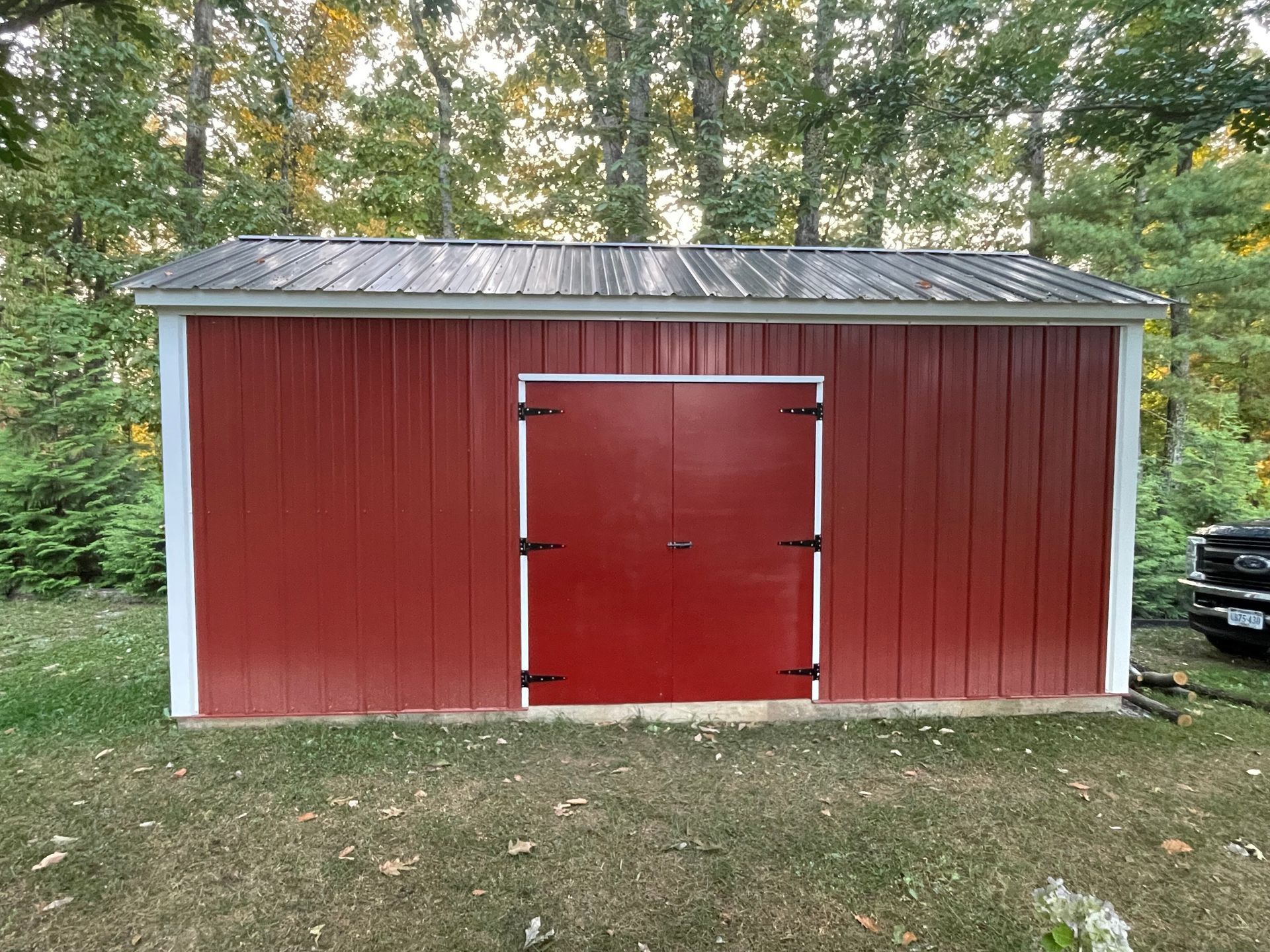 Green metal shed with large opening, small white doors, in a wooded area.