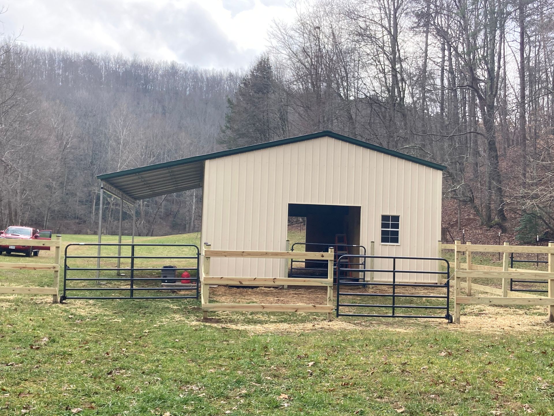 White barn with a black roof and sliding door, gravel driveway, and a wooden fence.