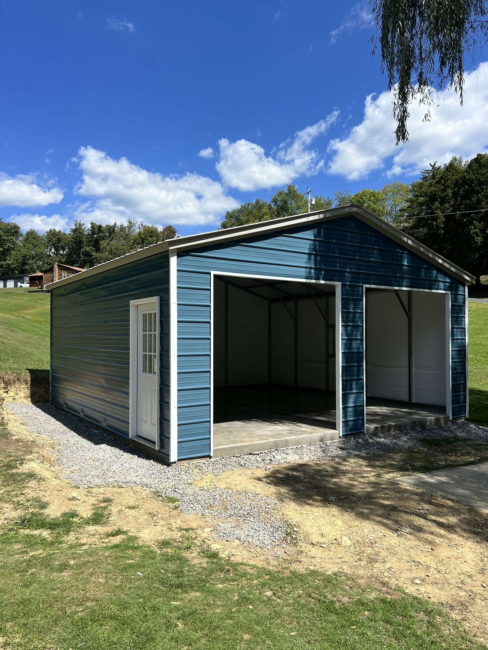 Metal garage with two doors and a side door, situated next to a house on gravel.