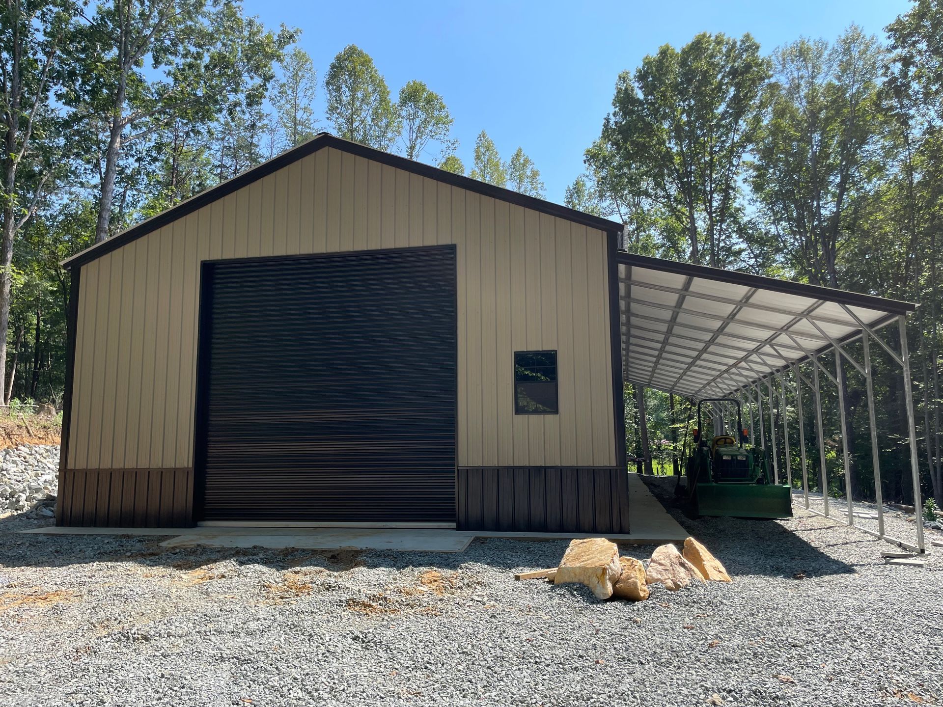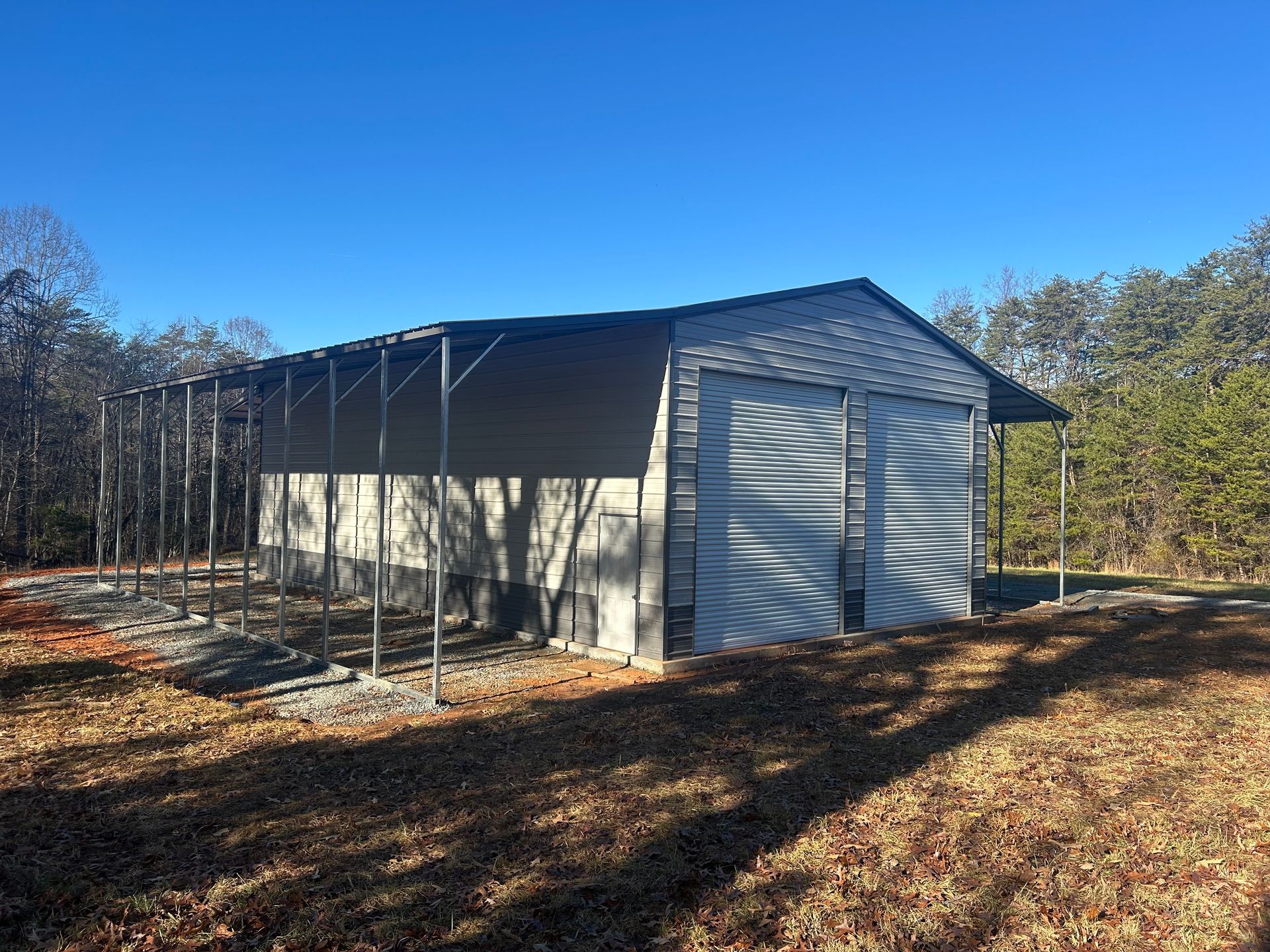 Gray metal building with two garage doors and a side door, gravel ground, and blue sky.